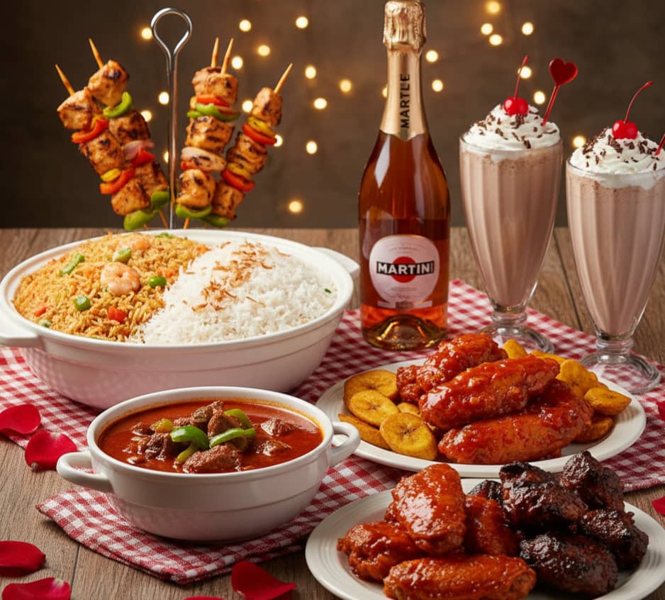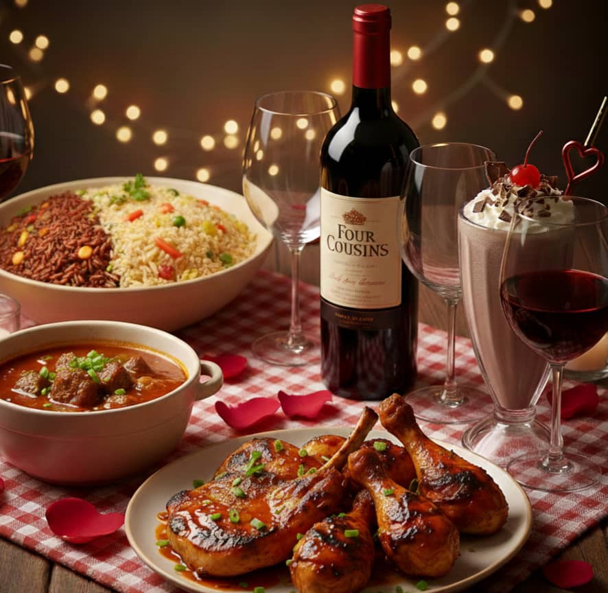 Goat Red Hugz/assorted Red Hugz (1 Portion), Grilled Turkey/BBQ Chicken (2 Portion), Jollof Rice/ Fried Rice (2 Portion), Chocolate/ Strawberry Milkshake (2 Glasses), one Bottle Of Four Cousin Wine