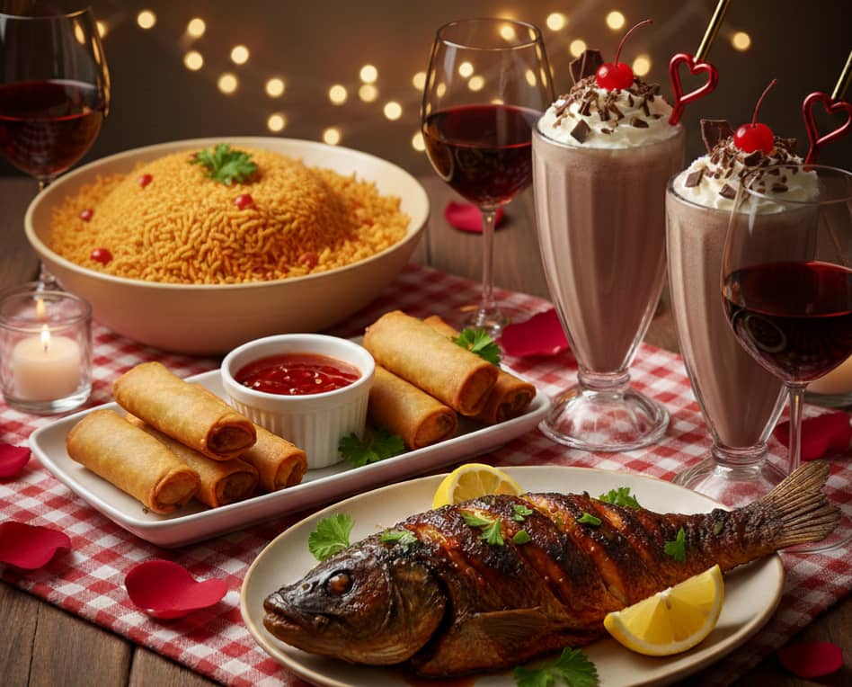 Spring Roll (1 Portion), Extra Large BBQ Catfish (1 Portion), Jollof Rice/ Fried Rice (2 Portion), Chocolate/ Strawberry Milkshake (2 Glasses), 2 Glass Of Wine